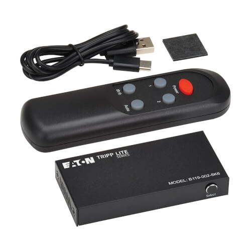 The B119-002-8K6 simplifies switching with three different modes to fit your application. You can use the push button on the unit to switch manually between HDMI sources or the included remote to control the inputs at a distance. You can also activate automatic port switching, which enables the most recently used source to be displayed automatically. The B119-002-8K6 also features an IR receiver on/off function.