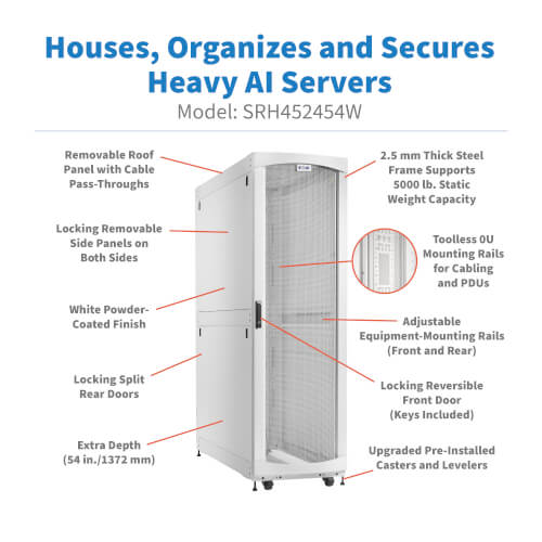 The SRH452454W is deeper than a standard rack’s 42 inches, instead offering 54 inches (1372 millimeters). The extra space accommodates larger, heavier AI servers that do not fit inside standard rack enclosures, as well as cabling and cable managers.