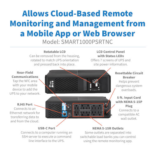 The SMART1000PSRTNC line-interactive cloud-connected UPS system combines cloud connectivity, remote management and advanced protection features. Its slim tower design is suitable for desktop or floor placement or installed in a rack (with optional mounting kit, sold separately). It’s recommended for home, office and retail use, as well as network closets in both local and remote locations.